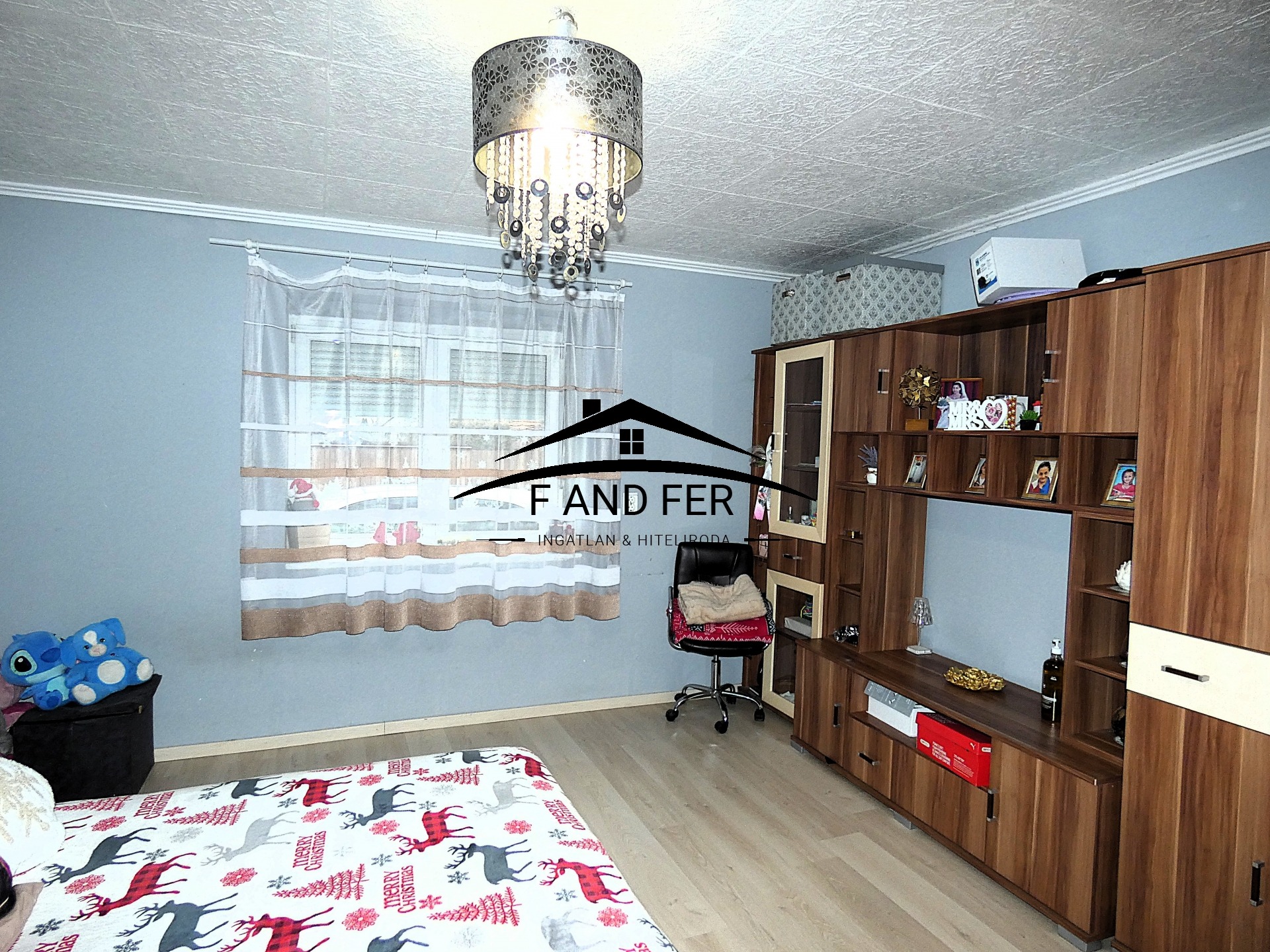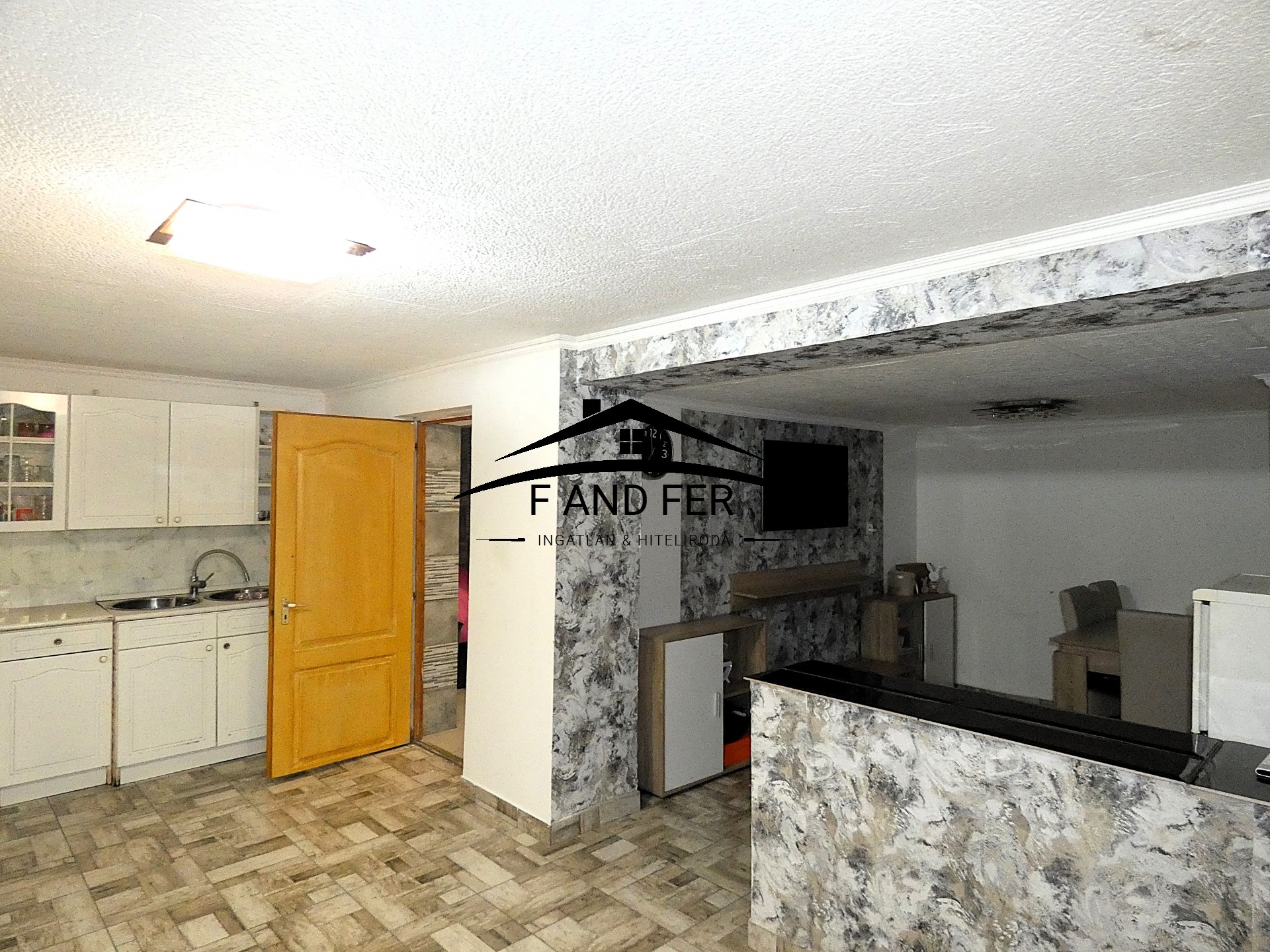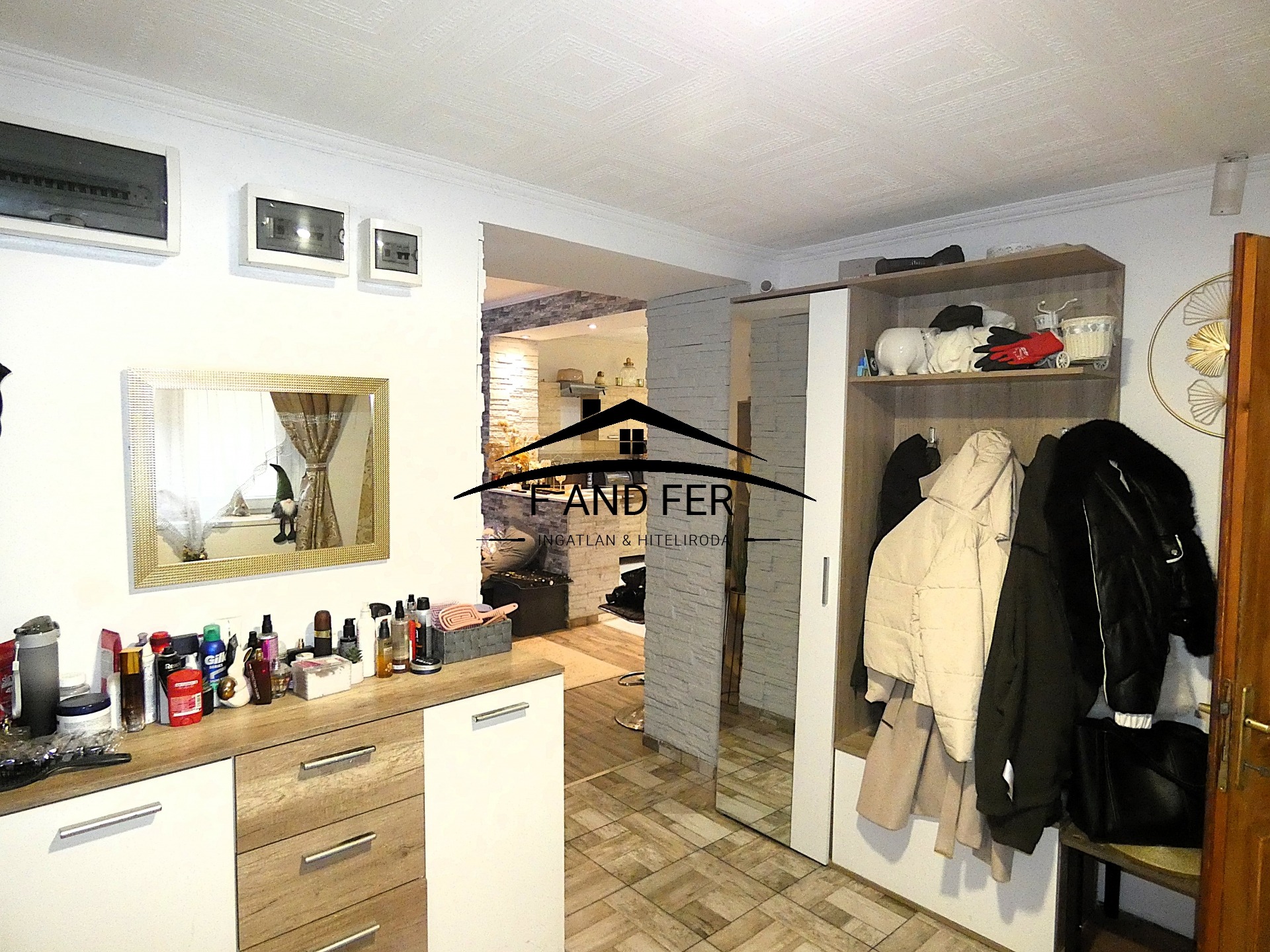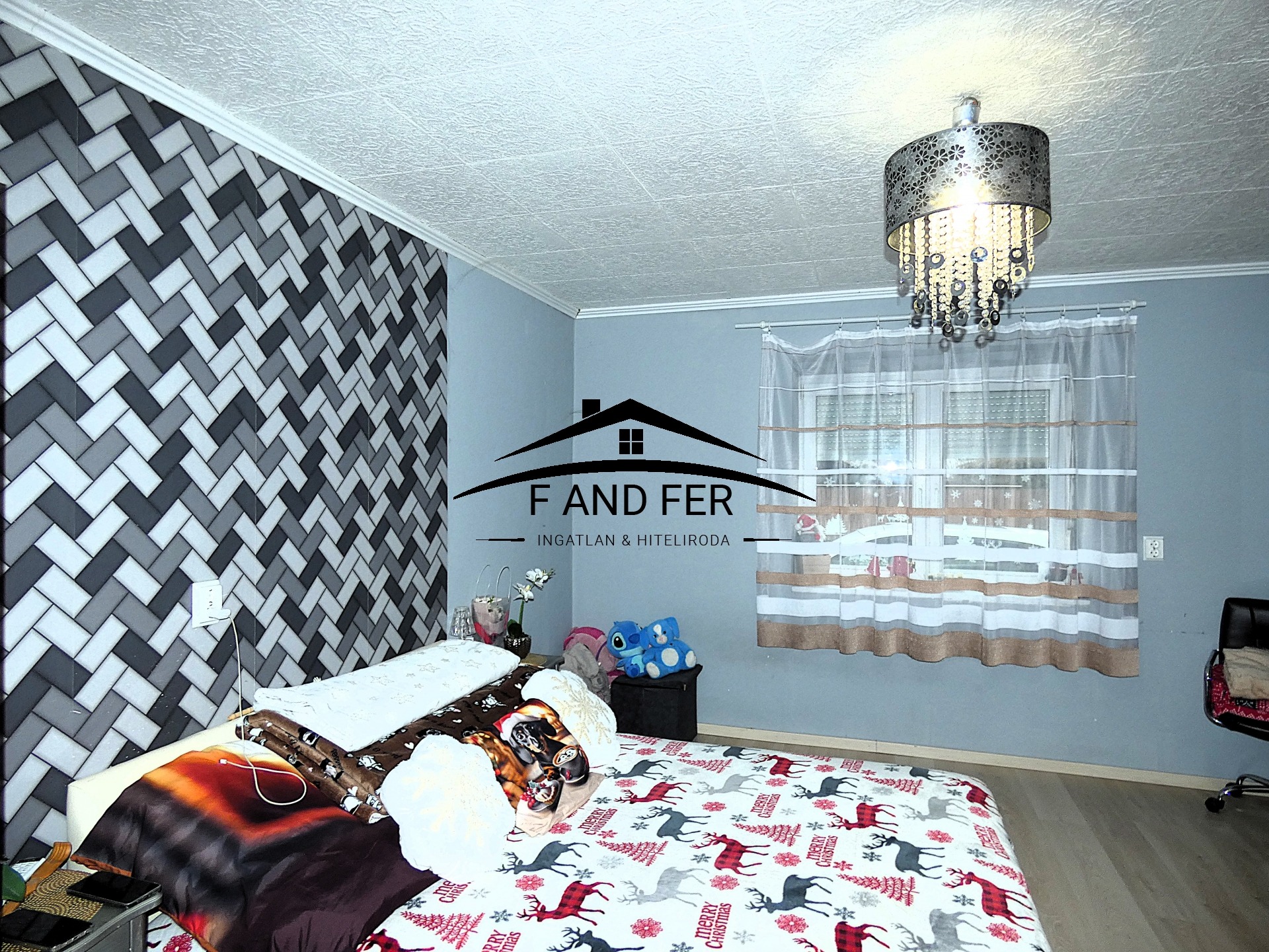 • A helyiségek ízlésesen burkoltak – a szobákban laminált parketta, a konyhában, közlekedőben és fürdőkben mázas kerámia található,